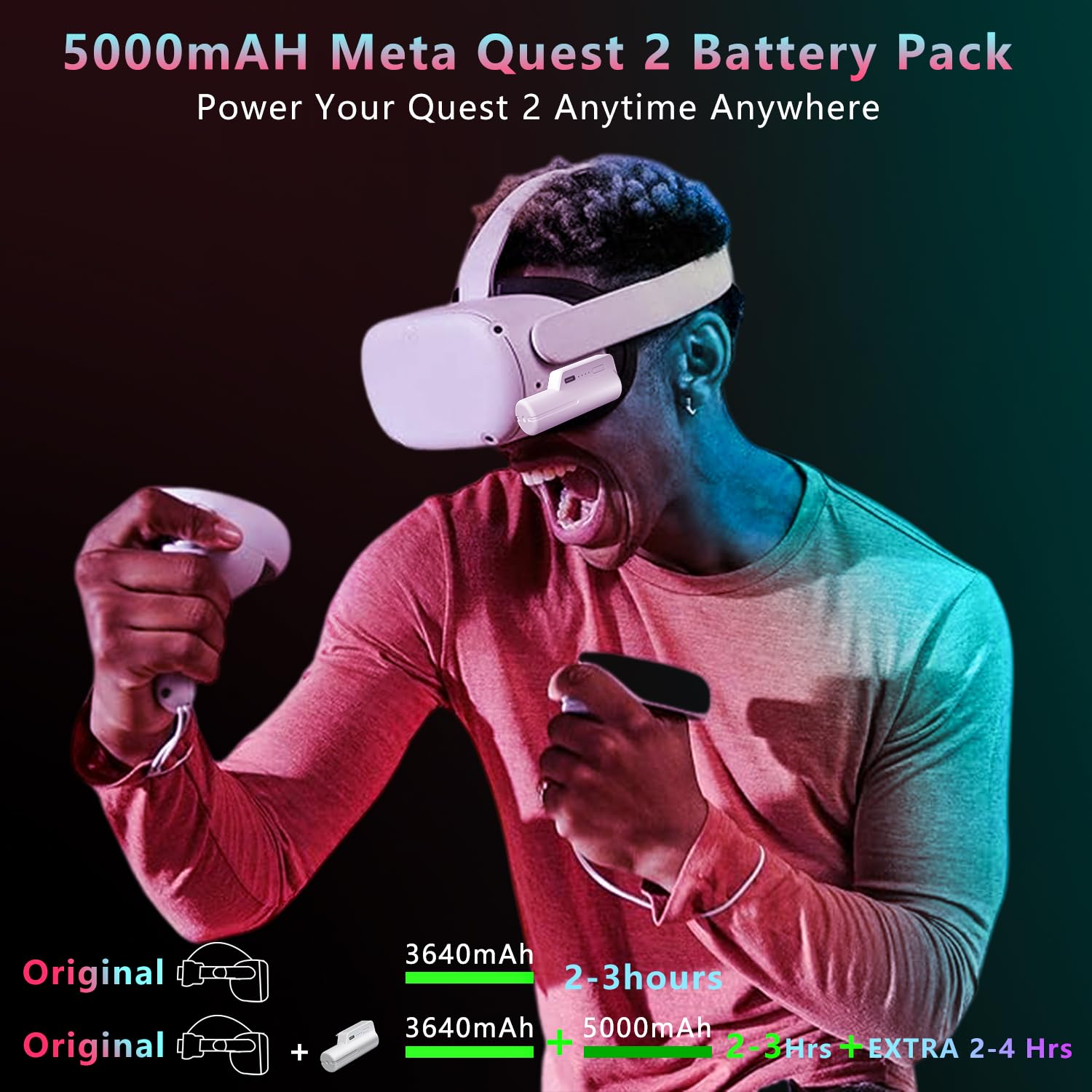 【Extend 2-4H Playtime】With an upgraded 5000mAh huge-capaity, this battery pack compatible with oculus quest 2 can extend your playtime 2-4H when fully charged, depending on the game you’re playing and your device settings